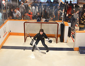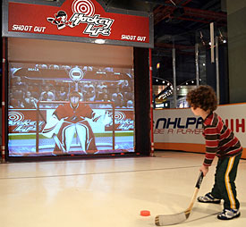 A young fan takes his turn at the free interactive game Pro Hockey Life Shoot Out. Click to enlarge.