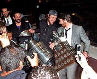 Past Conn Smythe Trophy winners and current members of the Kings front office, Bill Randford and Ron Hextall, join the 2012 winner Jonathon Quick in the moments following the Kings championship victory. (Craig Campbell/Hockey Hall of Fame) |
