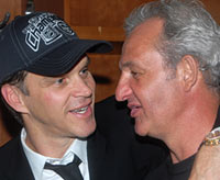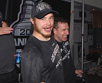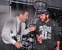 Goaltending coach, Bill Ranford and centre Mike Richards are showered with champaign in the dressing room following the Kings Stanley Cup victory. (Craig Campbell/Hockey Hall of Fame) |