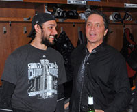 Los Angeles Kings defender Alec Martinez and General Manager Dean Lombardi celebrate in the dressing room following the club's Stanley Cup victory. (Craig Campbell/Hockey Hall of Fame) |