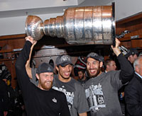 Trevor Lewis, Jordan Nolan and Dwight King raise The Stanley Cup in the dressing room following the Kings game 6 triumph. (Craig Campbell/Hockey Hall of Fame) |