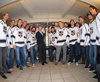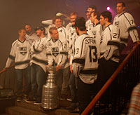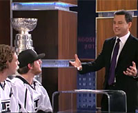 Host Jimmy Kimmel takes a sip from the most famous trophy in hockey. |