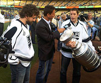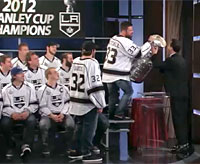Justin Williams and Rob Scuderi do an on-field interview at Dodger Stadium. |