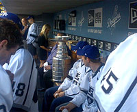 The Stanley Cup waits in the dugout at Dodger stadium prior to a game between the Los Angeles Dodgers and the Los Angeles Angels of Anaheim. |