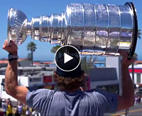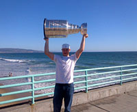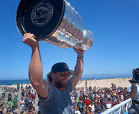 Dustin Brown raises The Stanley Cup on the pier at Manhattan Beach. |