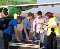 The Stanley Cup and its keeper, Phil Pritchard arrive in Russia greeted by Kings defender Slava Voynov. |