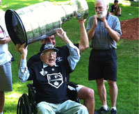 Kings trainer, Chris Kingsley, helps a 98-year-old Kings fan raise Hockey's Holy Grail in Westford, Massachusetts. |
