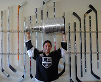 Martinez raises The Stanley Cup in front of his stick rack at his Allen, Texas home. |