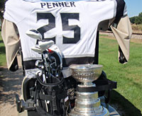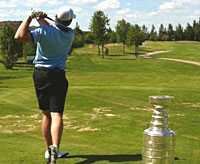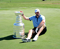 Like two old friends, Dustin Penner and The Stanley Cup pose for a photo on the 18th green at Winkler Centennial Golf Course. |
