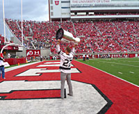 Trevor Lewis raises The Stanley Cup on the field at the University of Utah football game. |