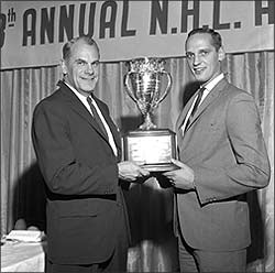 The Canadiens captured the Stanley Cup again in 1965-66. Their star defenseman was named to the NHL's First All-Star Team for a second straight year, and in spite of missing the last 13 games of the season, was named recipient of the Norris Trophy as the premier defenseman in the league.