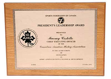 Plaque presented to outgoing CHA President Murray Costello by the Ontario Women's Hockey Association on May 20, 1998. |