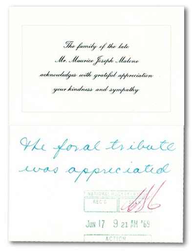 Thank you card sent by the Malone Family to the National Hockey League for the floral arrangement that was sent to them following the death of Joe Malone in May of 1969.