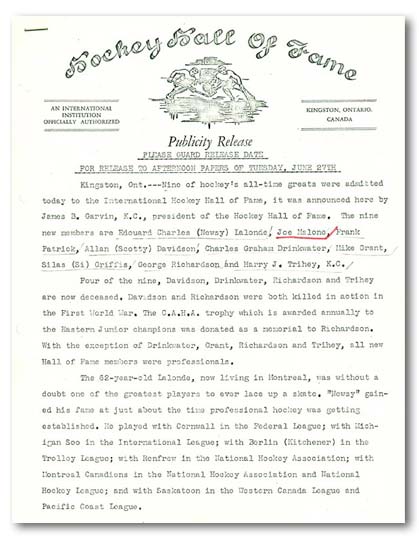 Press release from the International Hockey Hall of Fame in Kingston, Ontario announcing that Joe Malone is one of nine players to be inducted into the International Hockey Hall of Fame.