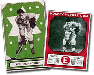 Red Horner's two rookie hockey cards: the 1933-34 O-Pee-Chee Series "A" card (left) and the 1933-34 Canadian Chewing Gum card.