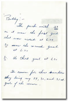 Letter from Bill Mosienko to Bobby Hewitson of the Hockey Hall of Fame explaining the numerical reference on the three pucks he used to score his three goals in 21 seconds against the New York Rangers on March 23, 1952. One puck has the #29, the second the #30 and the third the #31 which are his 29th, 30th and 31st goals of the season.
