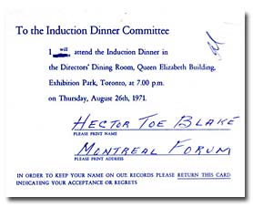 In order to compile a 'Who's Who' section in the National Hockey League's Guide and Record Book, players were asked to provide information on various topics, including their minor hockey career, accomplishments in other sports, ancestry, military service, and off-season employment. Here is one for Hector "Toe" Blake filled in by Jim Hendy. |