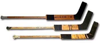 Three keepsake sticks from Terry Sawchuk's glorious career: (from top to bottom) the stick he used to record his 100th career NHL shutout on March 4, 1967; his 1953-54 stick which was also signed by his Red Wings Stanley Cup champion teammates; and a stick from his final season with Detroit in 1963-64.