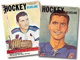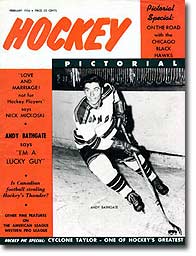 The career milestones of Andy Bathgate by way of hockey cards (from left to right): his rookie 1953-54 Parkhurst card as a Ranger; his 1964-65 Topps card as a Maple Leaf; and his 1970-71 final O-Pee-Chee card as a Pittsburgh Penguin. |