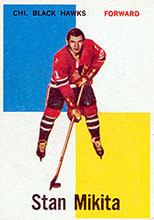 A 1960-61 Stan Mikita hockey card produced by Topps.