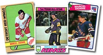 Three Dionne hockey cards: (from left to right) his rookie 1972-73 O-Pee-Chee card, his 1977-78 O-Pee-Chee card as an NHL First Team All-Star, and his 1988-89 O-Pee-Chee card.