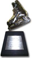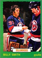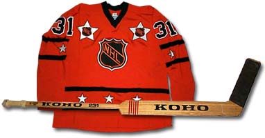 The goalie stick of Billy Smith from the November 28, 1979 match versus the Colorado Rockies, when he was credited with scoring the first goal by a goaltender in NHL history. |