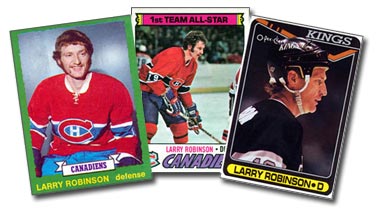 A selection of Larry Robinson hockey cards. From left to right: his rookie 1973-74 O-Pee-Chee card, a 1977-78 O-Pee-Chee "First Team All-Star" card, and a 1990-91 O-Pee-Chee card from his days with the Kings.