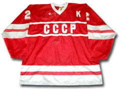 A USSR First Team All-Star defenseman in 1987, Viacheslav Fetisov wore this helmet during the 1987 World Championships in Vienna, Austria. Fetisov would lead his team to a silver medal while finishing tied for s econd with eight assists. |