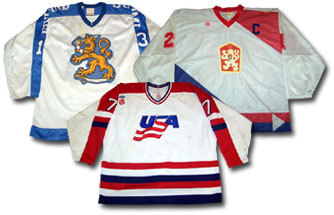 Jerseys worn by Veli-Pekka Ketola of Team Finland during the 1981 Canada Cup, Dusan Pasek of Team Czechoslovakia during the 1984 Canada Cup and Joe Mullen of Team USA during the 1991 Canada Cup.
