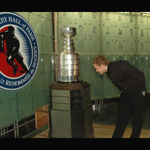 Prior to the autograph session Montreal Canadien defenseman Mike Komisarek took a moment to view the Stanley Cup and the recently added engravings.