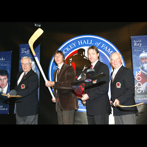 The newest Inductees show their stickhandling skills during a photo op for the media. Left to right, Harley Hotchkiss, Dan Brooks, son of his posthumously Inducted father, Herb Brooks, Patrick Roy, and Dick Duff.