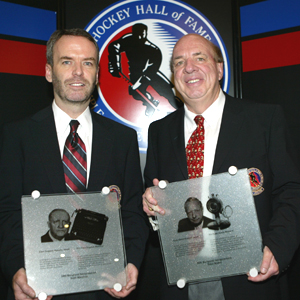 2006 Media Honourees Scott Morrison (left) and Peter Mahar (right) hold up the plaques they received at the Elmer Ferguson/Foster Hewitt Luncheon. (13-Nov-2006-Dave Sandford/HHOF)