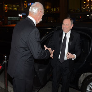 2018 Inductee Gary Bettman is greeted by Hockey Hall of Fame Chairman of the Board Lanny McDonald prior to the 2018 Hockey Hall of Fame Induction Ceremony. (Dave Sandford/Hockey Hall of Fame)
