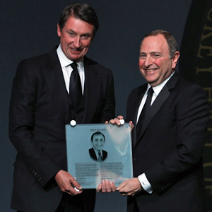 Gary Bettman receives his Honoured Members plaque from Wayne Gretzky during the 2018 Hockey Hall of Fame Induction Ceremony. (Dave Sandford/Hockey Hall of Fame)