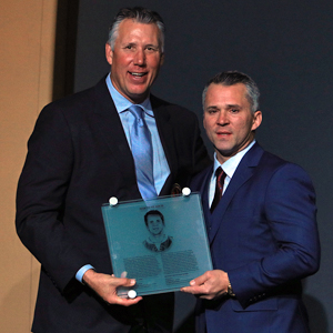 Martin St. Louis receives his Honoured Members plaque from Dave Andreychuk during the 2018 Hockey Hall of Fame Induction Ceremony. (Dave Sandford/Hockey Hall of Fame)