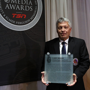 2018 Elmer Ferguson Award winner Larry Brooks with his media honouree plaque at the HHOF/NHL Media Awards Luncheon presented by TSN. (Dave Sandford /Hockey Hall of Fame)