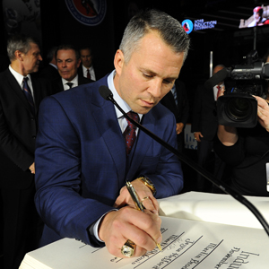 2018 Inductee Martin St. Louis signs the Honoured Members book during the 2018 Hockey Hall of Fame Induction Ceremony. (Matthew Manor/Hockey Hall of Fame)