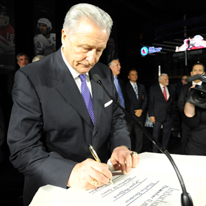 2018 Inductee Aleksander Yakushev signs the Honoured Members book during the 2018 Hockey Hall of Fame Induction Ceremony. (Matthew Manor/Hockey Hall of Fame)