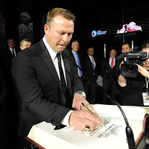 2018 Inductee Martin Brodeur signs the Honoured Members book during the 2018 Hockey Hall of Fame Induction Ceremony. (Matthew Manor/Hockey Hall of Fame)