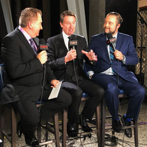 Hockey Hall of Fame Honoured Member Wayne Gretzky conducts an interview with Gino Reda and Pierre LeBrun of TSN prior to the 2018 Hockey Hall of Fame Induction Celebration. (Sarah Marcucci/Hockey Hall of Fame)