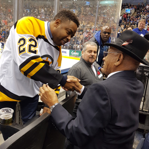 2018 Inductee Willie O'Ree meets with a fan prior to the Haggar Hockey Hall of Fame Legends Classic. (Joshua Dawson/Hockey Hall of Fame)