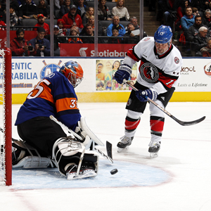 Wendel Clark is turned aside by Marty Turco at the 2018 Haggar Hockey Hall of Fame Legends Classic. (Mark Blinch/Hockey Hall of Fame)