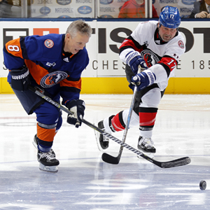 Igor Larionov of Team Fuhr skates with the puck while Wendel Clark of Team Belfour defends during 2018 Haggar Hockey Hall of Fame Legends Classic. (Mark Blinch/Hockey Hall of Fame)
