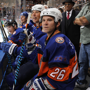 2918 Inductees Martin St. Louis and Willie O'Ree along with Team Fuhr teammates Dave Andreychuk and Pierre Turgeon look on from the bench during 2018 Haggar Hockey Hall of Fame Legends Classic. (Mark Blinch/Hockey Hall of Fame)