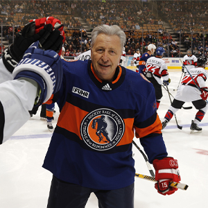 2018 Inductee Aleksander Yakushev of Team Fuhr celebrates after a goal against Team Belfour during the 2018 Haggar Hockey Hall of Fame Legends Classic. (Mark Blinch/Hockey Hall of Fame)