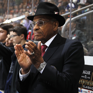 2018 Inductee Willie O'Ree looks on from the bench during 2018 Haggar Hockey Hall of Fame Legends Classic. (Mark Blinch/Hockey Hall of Fame)