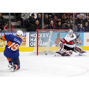 Shane Doan of Team Fuhr scores against Anthony Brodeur of Team Belfour during the 2018 Haggar Hockey Hall of Fame Legends Classic. (Mark Blinch/Hockey Hall of Fame)
