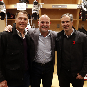 Devils legends reunited. Scott Stevens, Ken Daneyko and Scott Niedermayer are all smiles prior to the 2018 Haggar Hockey Hall of Fame Legends Classic. (Mark Blinch/Hockey Hall of Fame)