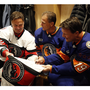 Shane Doan of Team Fuhr signs a jersey for Dino Ciccarelli of Team Belfour while Mike Gartner looks on prior to 2018 Haggar Hockey Hall of Fame Legends Classic. (Mark Blinch/Hockey Hall of Fame)