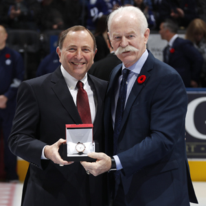 2018 Inductee Gary Bettman receives his Honoured Members blazer and Tissot watch from Hockey Hall of Fame Chairman of the Board Lanny McDonald. (Mark Blinch/Hockey Hall of Fame)
